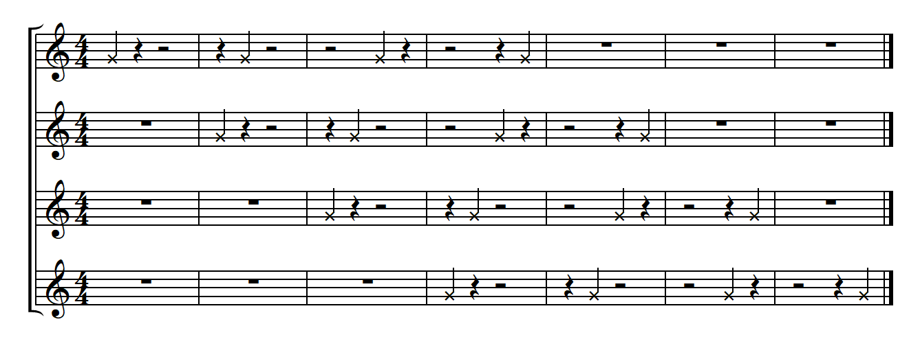The choir members probably understand the exercise well and are able to perform it. Now you introduce the next exercise. This time, you clap two eighth notes and this pattern is shifted towards the end of the bar: