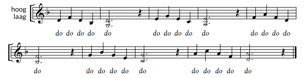 Next, you may sing the exercise in two voice groups, letting sopranos and tenors sing the high notes and the altos and basses the low notes (the exercise is transposed down a whole tone):